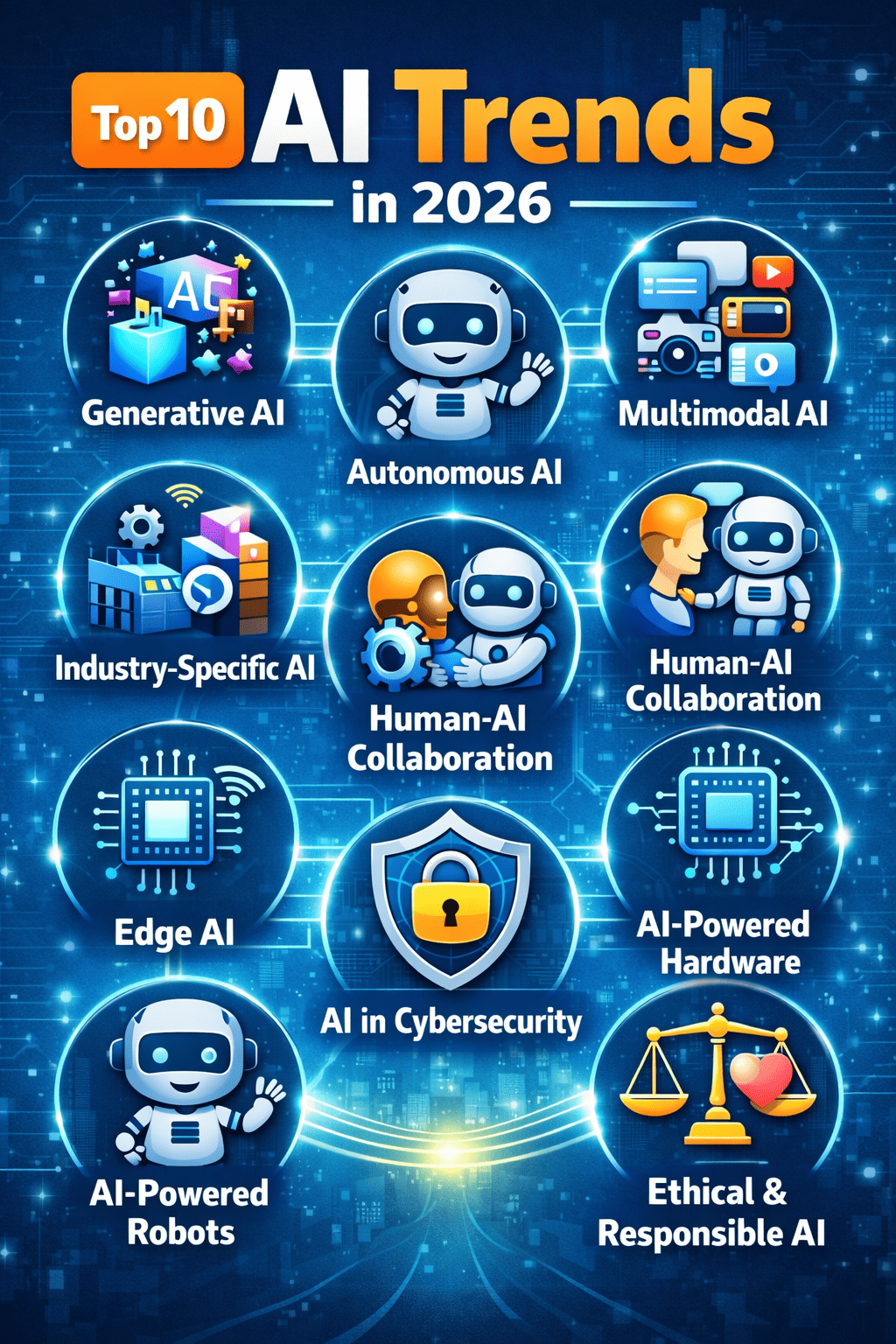 AI in Cybersecurity keeps us safe, AI-powered robots help us in real life, and Ethical AI ensures everything is done responsibly.